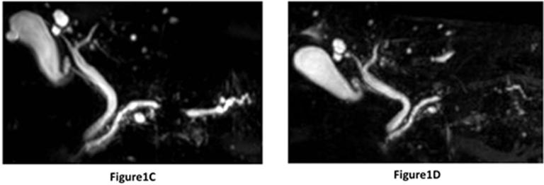 Figure 1A-D. Magnetic resonance cholangiopancreatography showing a remarkable change of main pancreatic duct (MPD); A. Multilobular cystic lesion in the pancreatic head and no narrowing of the MPD at first; B. Short narrowing of the MPD (length, 5 mm) proximal to the cystic lesion after 6 months; C. Short narrowing of the MPD (length, 12 mm) and slight upstream MPD dilatation (diameter, 5 mm) after 15 months; D. Segmental narrowing of MPD after 24 months. |