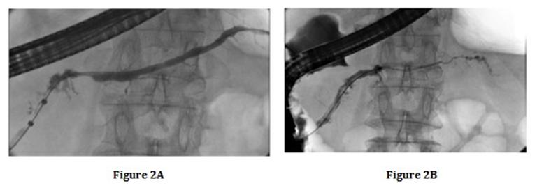 Figure 2A-B. Endoscopic retrograde pancreatography showing a remarkable change of MPD; A. Short narrowing of the MPD (length, 6mm) in the pancreatic body after 6 months; B. Segmental narrowing of the MPD after 24 months. |