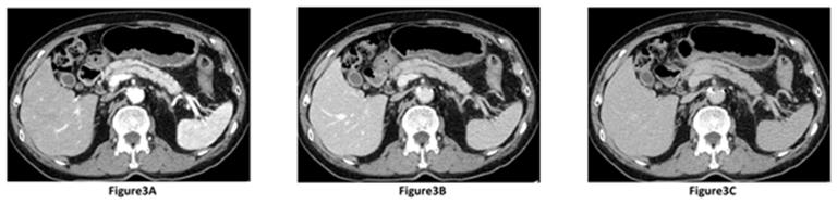 Figure 3A-C: Dynamic study of contrast-enhanced CT after 15 months; A. Hypoattenuating lesion of approximately 1 cm in diameter appears in the pancreatic body during the pancreatic phase compare to normal adjacent pancreatic parenchyma; B. Lesion appears isoattenuating during the portal venous phase compare to normal adjacent pancreatic parenchyma; C.Lesion appears isoattenuating during the delayed phase compare to normal adjacent pancreatic parenchyma. |