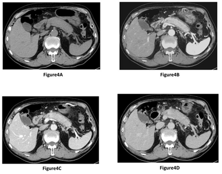 Figure 4A-D. Dynamic study of contrast-enhanced CT after 24 months; A. Segmental enlargement of the pancreas body and tail during precontrast phase; B. Segmental enlargement of the pancreatic parenchyma appears hypoattenuating during the pancreatic phase compare to normal spleen parenchyma, with a capsule-like low density rim; C. Pancreatic parenchyma appears isoattenuating during the portal venous phase compare to normal spleen parenchyma; D. Pancreatic parenchyma appears isoattenuating during the delayed phase compare to normal spleen parenchyma. |