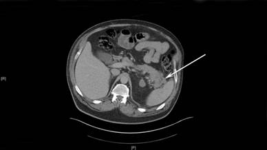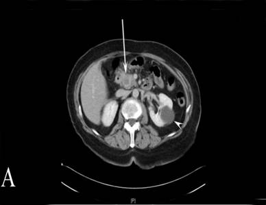 Figure 1. CT image depicting a bulky “soft tissue density” mass of the tail of the pancreas extending to the hilum of the spleen. The white arrow shows the mass. |