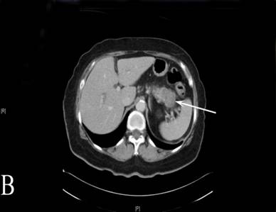 Figure 2. A. CT image depicting a mass at the uncinate process of the pancreas. The white arrow shows the mass. The white arrow head shows a cyst of the left kidney. B. CT image from the same patient showing the second mass at the tail of the pancreas in close proximity with vessels of the splenic hilum. The white arrow shows the mass. |
