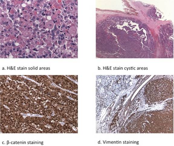 Figure 1. Histopathology and immunohistochemistry of SPT. a. Hematoxylin and eosin (H&E) stain of solid tumor areas demonstrating uniform polygonal cells with eosinophilic neoplasm, round nuclei with finely stippled chromatin and frequent groves admixed within capillaries. b. H&E stain of cystic tumor areas demonstrating mixed cysts characterized by degenerative changes with formation of pseudopapillary structures. c. Immunoreactivity for β-catenin shows cytoplasmic and nuclei positivity in most tumor cells. d. Vimentin staining is positive in almost all tumor cells. |