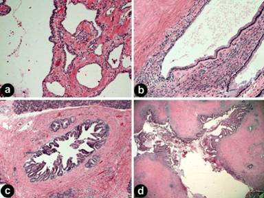 Figure 1. a. Serous cystadenoma with microcysts lined by bland cuboidal epithelium. b. Mucinous cystic neoplasm with cystic spaces lined by mucinous lining epithelium and surrounded by ovarian-type stroma. c. Intraductal papillary mucinous neoplasm involving a side branch of the pancreatic duct with low-grade dysplasia. Papillary projections are seen protruding into the lumen. d. Intraductal papillary mucinous neoplasm involving the main pancreatic duct, again showing papillary projections into the lumen, as well as associated fibrosis and chronic inflammation. |