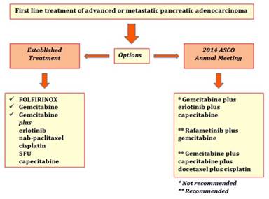 In this year’s ASCO Annual Meeting, four remarkable abstracts about advanced or metastatic pancreatic cancer were presented concerning first line treatment. The purpose of this paper is to dispose the data and the main findings of these studies as shown collectively in Table 1. The incorporation of the new data on a patient approach algorithm is illustrated in Figure 1.