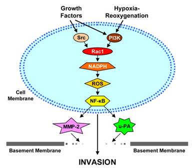 Figure 1. Model for Rac1/ROS/NF-κB-mediated pancreatic cancer invasion. Distinct signals such as growth factors and hypoxia-reoxygenation conditions activate PI3K and/or Src, which alone or combined switch on Rac1 in pancreatic cancer cells. Through NADPH oxidase, activated Rac1 induces formation of ROS. Once generated, these intermediate molecules activate NF-κB, which mediates secretion and activation of MMP-2 and/or u-PA in the extracellular milieu. These proteolytic enzymes are responsible for degradation of the basement membrane, promoting invasion by pancreatic cancer cells. For this common signaling pathway, mediators of Rac1 activation as well as proteolytic enzyme effectors seem to be cell type dependent. |