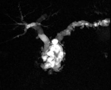 Figure 1. Fourteen years after diagnosis, MRI plus cholangio-pancreatography showed a sudden increase in size (60 mm x 26 mm) of the cystic lesion in the pancreatic head and diffuse Wirsung duct dilatation (8 mm). |