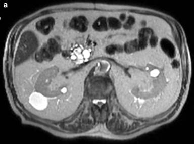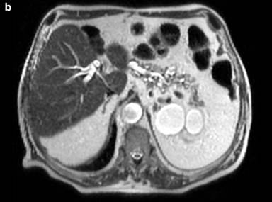 Figure 2. Fourteen years after diagnosis, axial MR images showed the cystic lesion of the pancreatic head and its communication (white arrow) (a) with a diffusely dilated main pancreatic duct (b). |