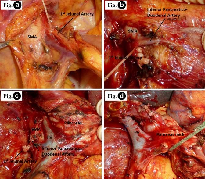 A laparotomy is performed through a median incision, then the left duodenomesocolic fold is incised, and the retroperitoneum is opened longitudinally. With the transverse colon lifted upward, the pancreatic head and the duodenum are then freed from the anterior surface of the inferior vena cava. After that, Kocher’s maneuver is performed to reflect the third and fourth part of the duodenum, and the pancreas becomes elevated so that a hand can be passed behind it to palpate the tumor mass. After dividing the right gastroepiploic vein, the anterior branch of the inferior pancreaticoduodenal vein and accessory right colic vein, and the anterior surface of the portal vein (PV) are carefully dissected from the posterior part of the pancreatic neck. The common hepatic artery is then carefully dissected, and the gastroduodenal artery is identified, ligated, and divided. The cholecystectomy is then performed, and the common bile duct is ligated and divided, allowing the PV to be dissected free from the pancreas at its superior edge. Tunneling through the pancreas in front of the portal vein is not performed. Depending on the type of procedure (Whipple or pylorus-preserving PD), the stomach or the duodenum is transected. After reflection of the duodenum and first jejunal loop beneath the mesenteric vessels, the first jejunal arteries can be divided (Figure 1a). The upper jejunal arteries usually arise from the left dorsal aspect of the (SMA). The next surgical step is complete separation of the SMA from the right retroportal process; the SMA is therefore set free until its entry into the mesentery, and this step is very important because during this stage, tumor involvement to the SMA can be identified. The ligament of Treitz is divided and the first jejunal loop (after mobilization of Treitz’s angle) is dissected. As the upper jejunum is pulled further to the right side through Treitz’s angle, the SMA is rotated in a clockwise direction to allow visualization of the inferior pancreaticoduodenal artery (IPDA) route from the SMA according to the landmark of the ligated first jejunal artery (right posterior approach), although the route of the IPDA is not clearly seen with either the left posterior approach or anterior approach (Figure 1b). Then, the pancreatic head along with distal common bile duct, duodenum (± distal stomach), and first jejunal loop is pulled up from the right side of the SMA after ligation of the IPDA route (Figure 1c). The dissection of the PV is continued up by inferomedial traction of the duodenum and pancreatic head, and then the PV is traced up to the level of the pancreatic neck by ligating and dividing the surrounding tissues, thus completely exposing the suprapancreatic PV. The posterolateral side of the PV is carefully dissected, ligating the tributaries. Since there is an avascular plane between the PV and pancreatic neck, after this dissection, the posterior surface of the pancreatic neck is exposed (Figure 1d). Finally, the pancreas is transected and the resected specimen is removed.