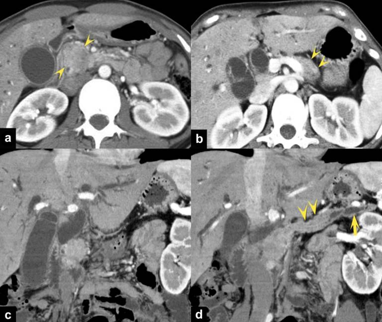 Figure 1. Triple-phase enhanced CT images at the arterial dominant phase demonstrate a well-enhanced mass (arrowheads) on the pancreatic parenchymal phase in the head of the pancreas (a.). The pancreatic head grows within the lumen of the MPD (arrowheads) in the body of the pancreas (b.). Curved multi-planar reconstruction images (c., d.) obtained at the arterial dominant phase clearly show the extending mass (arrowheads) into the MPD from the pancreatic head tumor. Note the dilatation of the upstream MPD (arrow). |