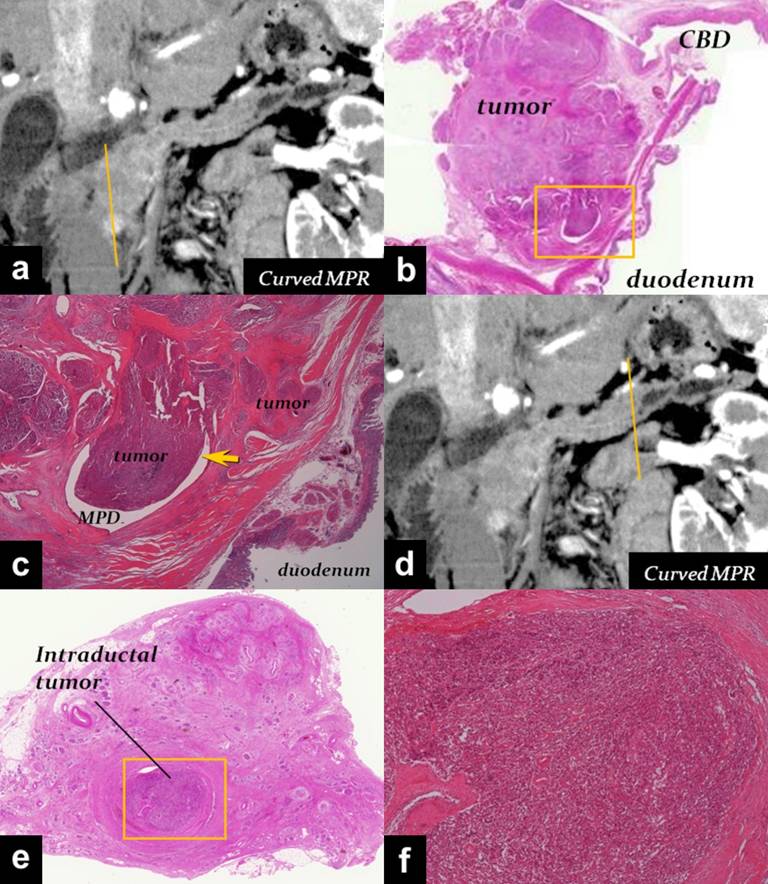 Figure 4. Radiologic-pathologic correlation (H&E stain). Pancreatic head tumor (a., b., c.). Pathological images corresponded to the cross-section (yellow line) of curved multi-planar reconstruction image (MPR) (a.) show direct invasion of the main pancreatic duct (MPD) (arrow in c.), and the duodenal muscle (c.). Pancreatic body region (d., e., f.). Pathological images corresponded to the cross-section (yellow line) of curved MPR (d.) show the intraductal tumor invading the lumen of the MPD with complete deficiency of the ductal epithelium and proliferation of collagenous tissue in the ductal wall (e., f.). |