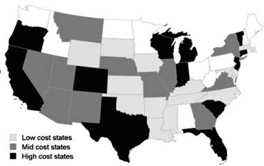 Within the U.S. health care system, spending varies considerably across state lines. This discrepancy is consistently demonstrated in higher per capita spending in states located within New England and the Mideast versus those in the Southwest and Rocky Mountain region [6]. Understanding these state-by-state differences in costs is critical for developing effective policies geared toward delivery of more efficient care [7].
