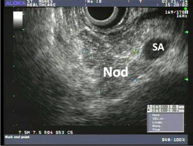 Figure 3. Endoscopic ultrasound showing a nodule (Nod) within the pancreatic tail, concordant with MRI, adjacent to the splenic artery (SA). |