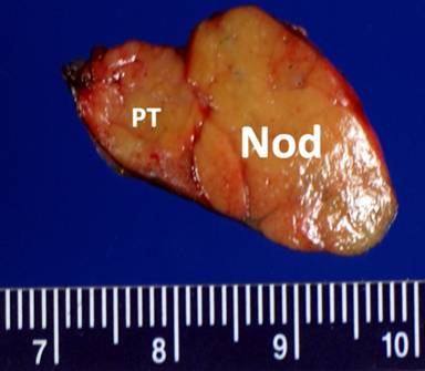 Figure 4. The resected, bisected specimen, showing the nodule (Nod); and the pancreatic-tail (PT) margin with staple line. |