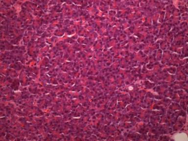 In this case, resection via distal (left) pancreatectomy was recommended, given evidence of a symptomatic and easily resectable lesion. Interestingly, although MRI, EUS, operative, and gross pathological findings were concordant with a bleeding PNET, viz., a lobular, discrete, firm, early-arterial-hyperenhancing mass at the tail of the pancreas, microscopic pathological evaluation revealed no neoplasm, only a nodule of pancreatic tissue containing a paucity of interlobular connective tissue and a relative loss of lobularity, imparting a pseudonodular appearance to the acinar and islet cells (Figures 4 and 5).