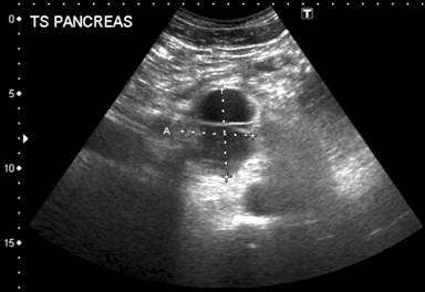 Figure 1. Ultrasound image of thick-walled septated cyst in relation to the neck of the pancreas. |