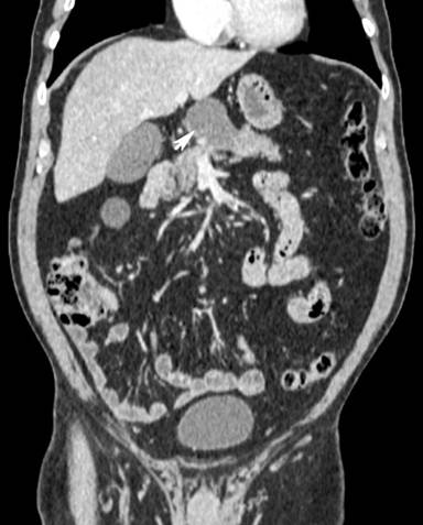 A 67-year-old man presented to the urologists with recurrent episodes of painless haematuria on the background of benign prostatic hypertrophy. An abdominal ultrasound scan demonstrated an incidental finding of a 5.7×4.7×4.4 cm thick walled avascular cystic structure with a thick septum in relation to the neck of the pancreas (Figure 1). Contrast enhanced computed tomography (Figure 2) confirmed the presence of a cyst related to the junction of the head and neck of the pancreas with otherwise normal architecture of the pancreas and no evidence of metastatic disease.
