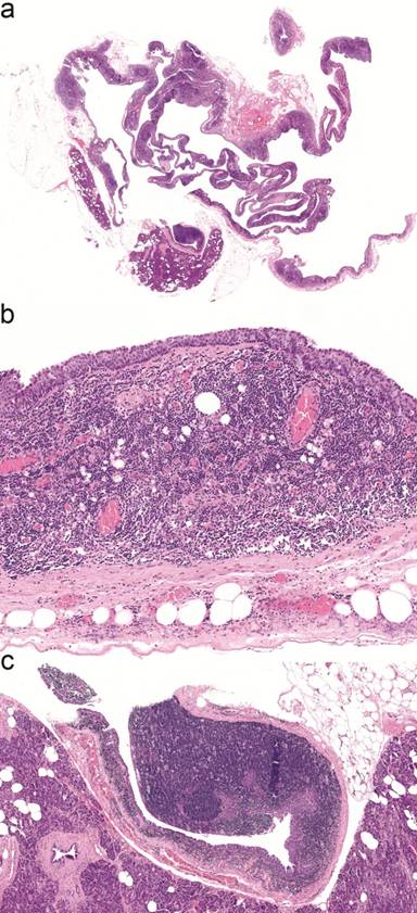 Histopathological examination (Figure 3) of the resected specimen revealed a completely excised multiloculated cyst measuring 60×30×10 mm lined with squamous epithelium with a transitional appearance and containing abundant lymphocytes in the wall, all consistent with a lymphoepithelial cyst. There was no evidence of dysplasia or malignancy.