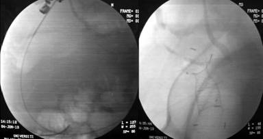 Figure 3. Guide wire in the cyst (left) and successful CSEMS deployment (right). |