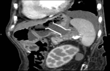 Final diagnosis: Probable slow growing benign IPMN with GOO symptoms, decompressed with a CSEMS with an anti-migration system complicated by a self-limiting intra-abdominal leak, stent migration and rupture of a splenic artery pseudoaneurysm.
