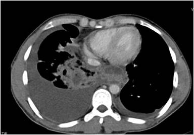 Figure 1. Chest CT demonstrates small posterior mediastinal collections along with lung parenchymal consolidations and small collections due to pancreatico-pleura-bronchial fistula. |