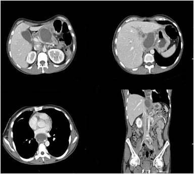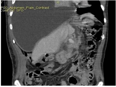 Figure 2. Coronal CT reformat demonstrates a linear pancreatico -pleural fistulous tract along the caudate lobe of liver. |