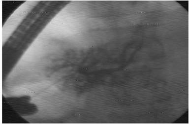 A twenty three year old male with chronic pancreatitis presented with complaints of cough, left sided chest pain and breathlessness of one day duration and was admitted in the department of pulmonology. Chest X-ray revealed moderate left pleural effusion. Pleural fluid analysis revealed significantly elevated levels of amylase of 25,569 U/L. CT scan demonstrated pseudocyst in the body of pancreas with a wide disruption in the posterosuperior aspect of the body of pancreas and fistulous tracts into the mediastinum and left pleura through the esophageal and aortic hiatus.Intercostal tube drainage was performed for pleural effusion. The patient was transferred to gastroenterology and was initially managed conservatively. Due to no significant improvement in clinical condition, endoscopy with ERCP and pancreatic ductal stenting was planned. Endoscopy demonstrated deformed duodenum and pulled up ampulla. Cholangiogram demonstrated dilated CBD and smooth stricture in the lower CBD for which wide sphincterotomy was done. Pancreatogram showed multiple areas of dye leakage in the main pancreatic duct suggestive of multiple ductal disruptions (Figure 4). The areas of dye leakage were present in the head and body with no areas of leakage in the tail region. The guide wire was negotiated upto the tail region, pancreatic duct sphincterotomy was done. A 7F 9 cm straight stent was placed across the pancreatic duct. The patient showed significant clinical improvement post procedure. The total hospital stay was of fifteen days. Pancreatic duct stent removal was done endoscopically after further three months (total seven months after they were inserted). There has been no recurrence of any fluid collections in the chest.