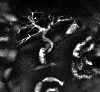 Figure 1. Magnetic resonance cholangiopancreatography demonstrating significant intra-hepatic biliary duct dilatation (arrows) but no extra-hepatic or common bile duct dilatation. |