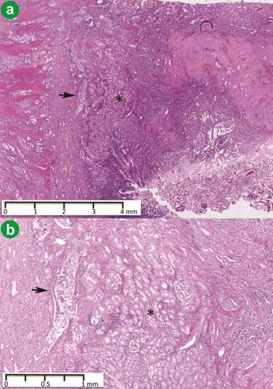 Figure 2. a. Endocrine tumor (*) with adjacent adenocarcinoma invading into muscularis propria (arrow) (hematoxylin and eosin stain ×25). b. Endocrine tumor (*) with adjacent adenocarcinoma (arrow) (hematoxylin and eosin stain ×50). |
