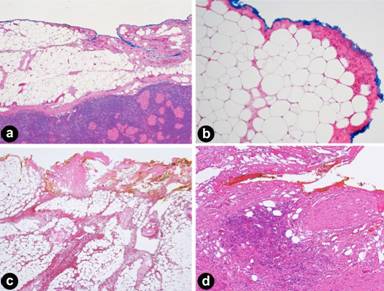 Figure 1. Tissues at the resection margin are well preserved: a smooth, undisrupted tissue surface, only focal minimal hemorrhage (a.) and intact cell morphology (b.). Extensive and severe tissue fragmentation with bleeding (c.) and cell damage (d.) precludes accurate microscopic assessment of the resection margin. |