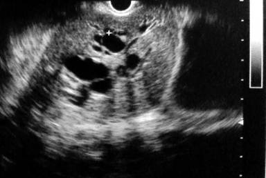Figure 1. Upper GI endoscopic ultrasound showing pancreatic head mass. |