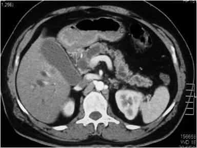 Figure 2. CECT abdomen showing pancreatic head mass with dilated main pancreatic duct. |