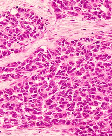 Figure 4. H&E section showing poorly differentiated tumour cells within cellular desmoplastic stroma. |
