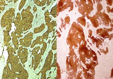 Figure 5. Tumor cells showing cytokeratin (left) and neurone specific enolase (right) positivity. |