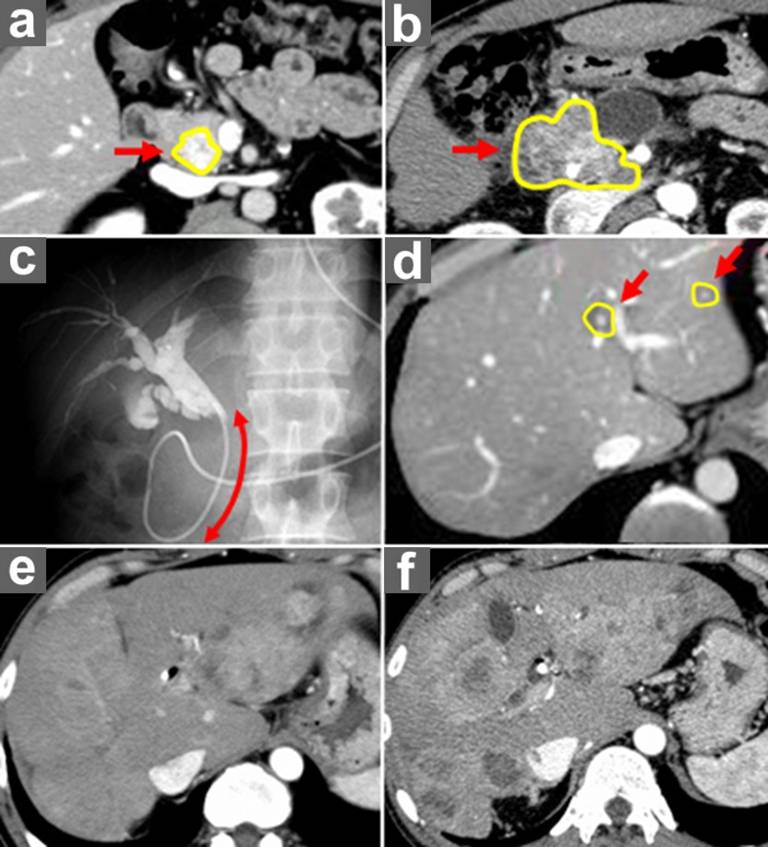 A thirty-nine-year-old man was diagnosed with nonfunctioning P-NET in the pancreatic head, with multiple liver metastases (Figure 1ad). Imaging revealed no extrahepatic metastases, and endoscopic fine-needle aspiration and liver needle biopsy showed well-differentiated GEP-NET G1. The tumor was 2.5 cm in diameter (Figure 1a) and nonfunctioning. Small but multiple metastases were detected in the liver (Figure 1d). He was asymptomatic at that time. We initially intended to control the liver metastases before resection of the primary tumor, because we considered liver metastases as the most important factor in the prognosis. Initially, transarterial chemoembolization (TACE) and transcatheter arterial infusion (TAI) were repeated. Thereafter, systemic chemotherapy and biotherapy were introduced according to follow-up assessments. Unfortunately, imaging assessment at about 10 months later revealed that the liver metastases were partially enlarged, although some were successfully treated. Therefore, these therapies were switched to other regimens, and TACE/TAI, systemic chemotherapies and biotherapies were repeated. Although liver metastases temporarily seemed to be stable (Figure 1e), the primary tumor was extended, even after therapy (Figure 1b). At 3.5 years after initial diagnosis, the primary tumor caused symptoms of pain and obstructive jaundice (Figure 1c). Selective inhibitor of mammalian target of rapamycin (mTOR) was given, and obstructive jaundice was treated by metallic-stent placement. Liver metastases were enlarged (Figure 1f), and there was massive swelling of the para-aortic lymph nodes. Thereafter, palliative therapy was the principal course of action. He finally died at 4.3 years after initial diagnosis.