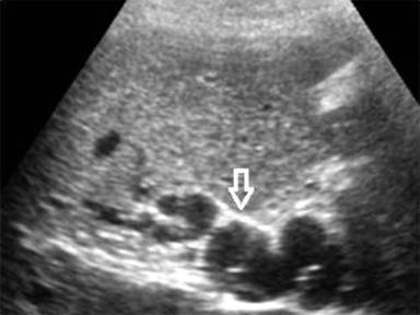 Figure 1. Sonogram shows replacement of main portal vein with multiple serpiginous, anechoic channels (arrow) that on color Doppler interrogation revealed slow flow. |