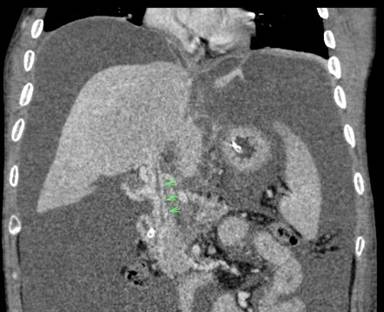 Figure 2. CECT coronal reformation demonstrates dilated common bile duct (green arrows) surrounded by numerous collaterals in a setting of portal biliopathy. |