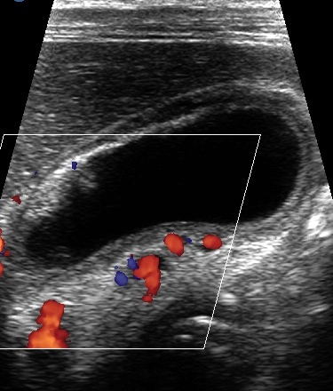 Figure 3. Sonogram depicts dilated venous channels in the wall of gall bladder. |