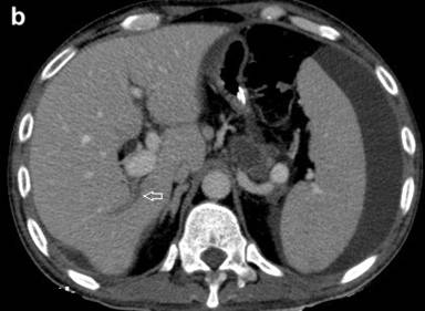 Figure 4 a. CECT arterial phase demonstrated a sectorial type of transient hepatic attenuation difference with a straight border (solid arrow). Also noted are thrombosis in a tributary of portal vein (arrow) with fluid collection in the body of pancreas. b. CECT venous phase shows near complete resolution of transient hepatic attenuation difference with thrombosis in a tributary of portal vein (arrow). |