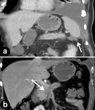 Figure 1. a. Reformatted coronal CT image shows a small volume of rim enhancing fluid in the left upper quadrant tracking from the tail of the pancreas to the left hemidiaphragm (arrow). A large left pleural effusion is also seen. b. Coronal CT image shows dilatation of the main pancreatic duct in the body of the gland with an abrupt cut-off in the region of the pancreatic head at the site of a 2.3 cm mass (arrow). |