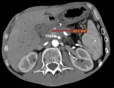 Figure 1. Contrast enhanced CT scan at the time of diagnosis. A: aorta; P: pancreatic lesion; SMA: superior mesenteric artery |