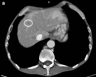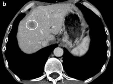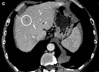 Figure 2. a. The contrast enhanced CT revealed newly found liver metastases (marked) suggestive of disease progression. b. The contrast enhanced CT image before HIFU showed a hypodense lesion of a liver metastasis about 14 mm in diameter in the right lobe (segment seven). c. Twelve months after the combination treatment with HIFU and chemotherapy the liver metastases were significantly reduced on the contrast control CT. |