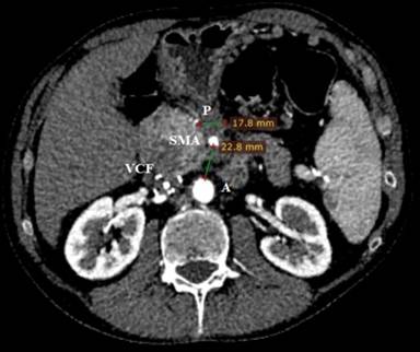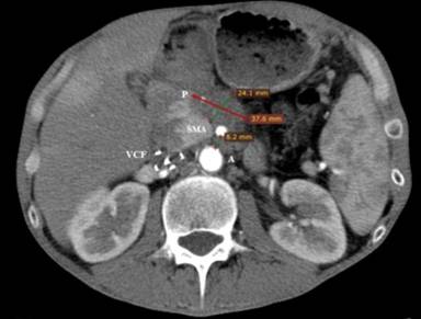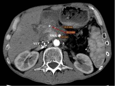 Figure 3. Contrast enhanced CT, obtained before HIFU treatment on March 19th, 2013. The distance between the aorta (A) and the superior mesenteric artery (SMA), compressed by the tumor mass is about 8 mm. P: 38 mm hypodense tumor lesion of the pancreas; VCF: vena cava filter |