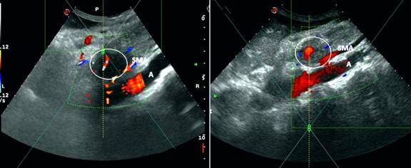 Figure 4. Ultrasound image of the hypo-echogenic tumor before HIFU ablation with infiltration of the SMA (on the left side) and the hyper-echogenic changes of the tumor mass immediately after HIFU procedure (on the right side). |