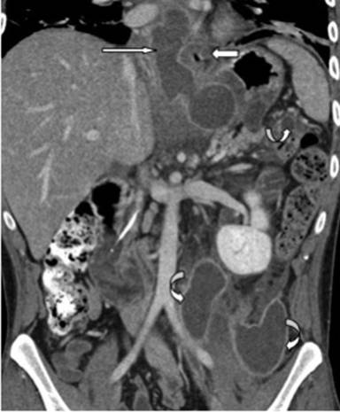 Figure 1. Case #1. Coronal reformatted CT image acquired following intravenous contrast medium in portal phase. This demonstrates a well-defined, rim enhancing pseudocyst (long arrow) extending through the hiatus into the posterior mediastinum. The gastro-oesophageal junction is displaced medially (short arrow). Several further retroperitoneal pseudocysts are noted (curved arrows). |