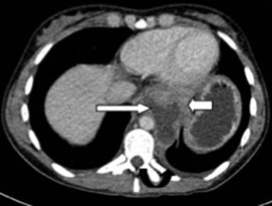 Figure 2. Case #2. Axial CT image acquired in portal phase following intravenous contrast medium. This demonstrates a well defined pseudocyst (long arrow) extending through the hiatus into the posterior mediastinum. The gastro-oesophageal junction (short arrow) is displaced anteriorly. There is a small reactive, non enhancing left pleural effusion (curved black arrow). |
