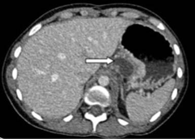 Figure 3. Case #2. Axial CT image of the patient in figure 1 acquired in portal phase following intravenous contrast medium. This demonstrates the component of the pseudocyst abutting the pancreas (arrow). |