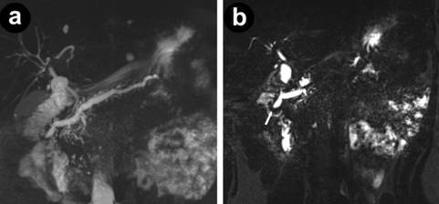 Figure 1. Magnetic resonance imaging showing a diffusely dilated pancreatic duct (a.) from the level of the minor papilla with the finding of pancreatic divisum. (b.) Impression of a mass (arrow) at the minor papilla can be seen. |