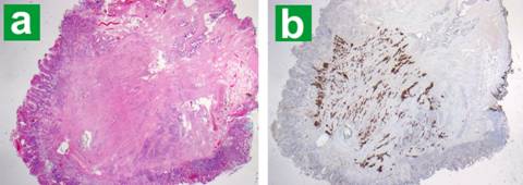 Figure 3. a. Low power (x20) Hematoxylin and Eosin -stained section of minor papilla expanded and obliterated by tumor. b. Tumor is highlighted with synaptophysin immunohistochemistry (x20), well clear of the resection margin. |