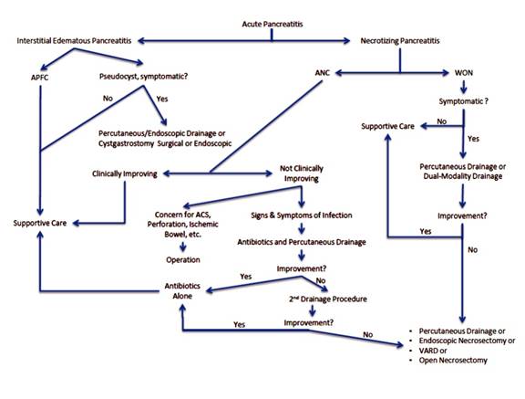 Figure 1. Suggested algorithm for the management of acute pancreatitis. Abbreviations: See text. Disclaimer: This algorithm is derived generalizations of the literature, with the understanding that there is significant overlap among pathways and no one algorithm can adequately address all patients; diagnostic and treatment decisions should not rely solely on the information presented here. |